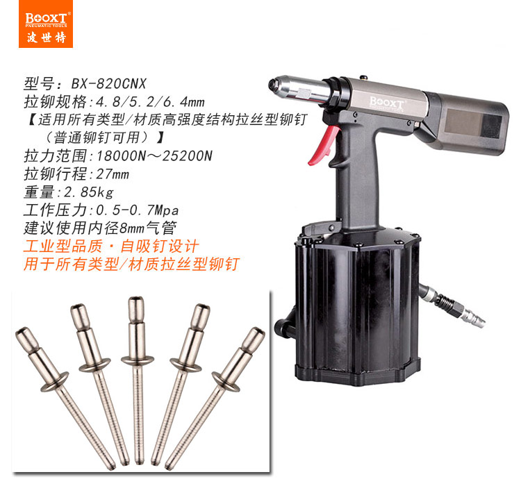東莞市強勁五金工具有限公司提供臺灣BOOXT波世特品牌氣動工具,自吸式氣動拉絲鉚釘槍BX-820CNX廠家直銷,首件享特價。咨詢熱線:4008301980