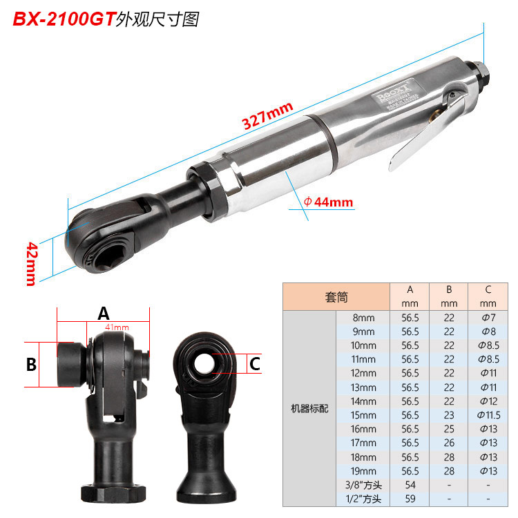 標配套筒:8/10/12/13/14/15/16/18/19+3/8"方頭,1/2"方頭