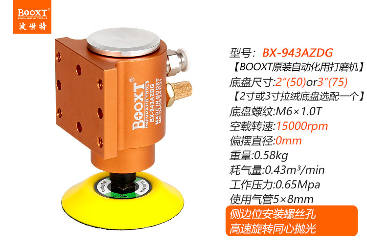• 產(chǎn)品參數(shù): 底盤尺寸:50mm/75mm (2寸/3寸) 空載轉(zhuǎn)速:15000rpm 重 量:0.58kg 耗 氣 量:0.43m3/min 【同心/高速/側(cè)邊安裝】