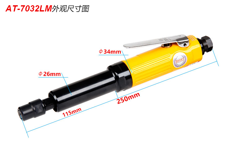 • 產(chǎn)品參數(shù): 夾頭能力:M3,M6 【標(biāo)配M6】 馬達(dá)功率:0.3HP 空載轉(zhuǎn)速:25000rpm 長(zhǎng)桿直徑:26mm 長(zhǎng)桿長(zhǎng)度:115mm 全 長(zhǎng):250mm 重 量 : 0.54kg 耗 氣 量:0.45m3/min 【專(zhuān)業(yè)型】