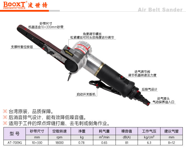 東莞市強(qiáng)勁五金工具有限公司提供臺灣BOOXT波世特品牌氣動工具,AT-7009G圓手柄氣動砂帶機(jī)廠家直銷,首件享特價。服務(wù)熱線:4008301980
