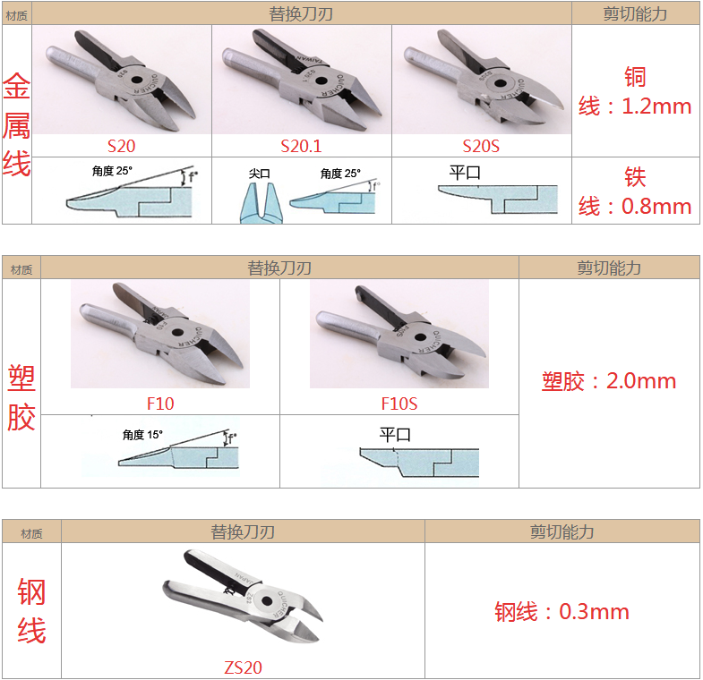 2.注意材質(zhì):材質(zhì)對選配刀刃非常重要,例如客戶要剪的銅鐵、材質(zhì)有鍍鈦、鍍烙、塑料材質(zhì)、加纖維超過20% 時,一般刀刃不是剪不斷,就是使用壽命大大減少,塑料還容易在剪斷過程中碎裂。在這情形S刀刃應(yīng)選擇Z刀,塑料則建議使用電熱剪。